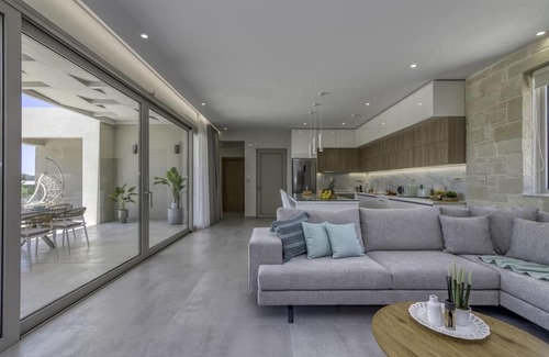 The open-plan kitchen is fully equipped for everything from a quick breakfast to a Cretan feast, flowing into the bright dining area with direct access to the garden and pool. The living area, with comfortable sofas and a smart TV, is perfect for relaxing evenings or social moments.