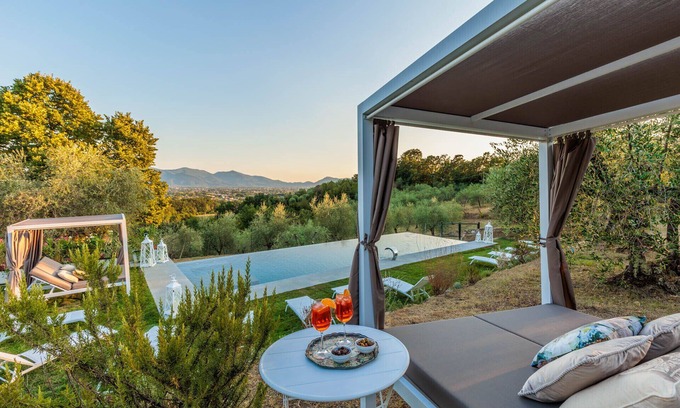 Lucca and the surrounding hills form a postcard-perfect panorama at Villa Noa. This stunning old farmhouse was built on a hill overlooking the city to take full advantage of the views, and was recently renovated to offer modern style and luxury. Invite up to sixteen friends or family members for a serene country retreat, or use the estate for a honey-moon- style getaway to one of the most scenic destinations in Tuscany. Drink in the views from outdoor living spaces with sitting and dining areas. Inside, romantic master bedrooms with marble-splashed bathrooms, a spacious fully equipped kitchen, air conditioning and Wi-Fi round out the list of hotel-worthy amenities. While the home’s surroundings are of a grand scale, the interiors of Villa Noa are cozy and inviting. In the open-plan living and dining room, warm neutral tones and slipcovered sofas and chairs lend a certain rustic elegance. The villa has eight bedrooms, including two on the ground floor for greater accessibility. Some of the rooms open to a balcony or to a porch. You can fall asleep to the sound of the wind meandering through the almost 700 olive trees that adorn the property and produce an exquisite olive oil. Like the main living areas, the bedrooms charm with warm neutral tones and farmhouse-inspired original furnishings. Set just outside the village of Marlia and close to the hamlet of Valgiano, Villa Noa puts you a short drive from Lucca old town, as well as a wide range of shops, supermarkets, restaurants, grocery stores, delis, bakeries and much more in the village of Marlia. Once at Villa Noa, catch up on some reading beneath shady pergolas, work on your tan by the glorious infinity swimming pool and take advantage of its jacuzzi corner while surrounded by your private view. A stroll through the woods of the estate will indulge your soul. In the afternoon, fire up the BBQ and grill something fresh from a local market. At dinner, the fully-equipped kitchen is sure to inspire your inner chef. Or, you could bring in a private chef to create a menu of delicious Italian cuisine. After dinner, take a bottle of wine out and sit on the pool-edge while the sun sets over the rolling hills. This region of Tuscany offers countless opportunities to experience the long and diverse local history, starting with enchanting Lucca (15 minutes away) with the best preserved Amphitheatre in the Roman world to Pisa, San Miniato and Montecatini Terme which are between a 30 to 60 minute drive away. Florence, San Gimignano, Versilia Coast, Chianti wine region and Cinque Terre (five mirage-like villages built along the dramatic coastline) are also fabulous historical sites to visit during your stay and are approximately a 1 hour drive away. Pistoia, Volterra, Siena, Bolgheri, Viareggio, Forte dei Marmi, Garfagnana, Valdinievole and the Versilia Coast are also all within easy reach. Or you can choose to enjoy the region as visitors have done for centuries: simply admiring the views and letting the surrounding vineyards and olive trees refresh your spirit.Directions: At the sign "Valgiano" (location provided) go straight on the dirt road and always keep to the right until you reach the gate with the white walls (Villa Noa).COMPOSITION:Ground Floor: entrance hall, grand living room, kitchen, dining room, 1 master bedroom with double bed and ensuite bathroom, 1 master bedroom with double bed, 1 bathroom, porch/verandaFirst Floor: 2 master bedrooms with double beds and 2 ensuite bathrooms, 2 twin bedrooms with 2 ensuite bathrooms (one of which has a balcony with view that provides access to the 7th and 8th bedrooms as specified here below. On the first floor there are 2 more master bedrooms with double beds with 2 ensuite bathrooms (one of which comes with a private terrace with view) accessible through a separate entrance from the garden or through the balcony of one of the twin bedrooms.Note: Fireplaces are not usable. The number of guests must meet the maximum occupancy indicated, children included, and no additional guests, nor parties or events, are allowed.Included in the rental price:Final CleaningTowels and linensElectricityGasWaterInternet WifiHigh chair (upon request at booking)Babycot (upon request at booking)Not included in the rental price:Tourist tax: mandatory and required by the local municipality, where applicable.Midstay and/or weekly cleaning and change of towels and linensBaby cot's linens
