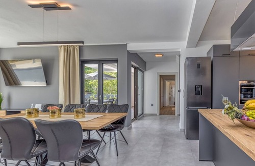 Villa Nona is a new, beautiful, modernly designed luxury villa. Besides its original design, the interior is equipped with high-quality and carefully designed furniture. The property consists of a living room with a view of the crystal-clear swimming pool and nicely cultivated garden. The living room also has an exit to a beautiful covered terrace with an outdoor dining table, perfect for meals with your family and friends. The kitchen is equipped with all the necessary appliances. The dining room and living room are on the ground floor and one double bedroom with its own bathroom. Three other double en-suite bedrooms with their own bathrooms are located on the first floor. Air conditioning is available in each bedroom and in the living room. Wi-Fi, satellite TV, PlayStation 4 gaming console, PlayStation VR, a gym with a treadmill and a stationary bike, as well as a billiards table, a foosball table and table tennis are also provided for your entertainment. In the garden, you can enjoy sun loungers by the 36 m2 swimming pool. In the immediate vicinity of the villa (50 m), there is a famous restaurant offering local specialties, as well as an adrenaline park. We can guarantee that this will be a vacation you won't forget!