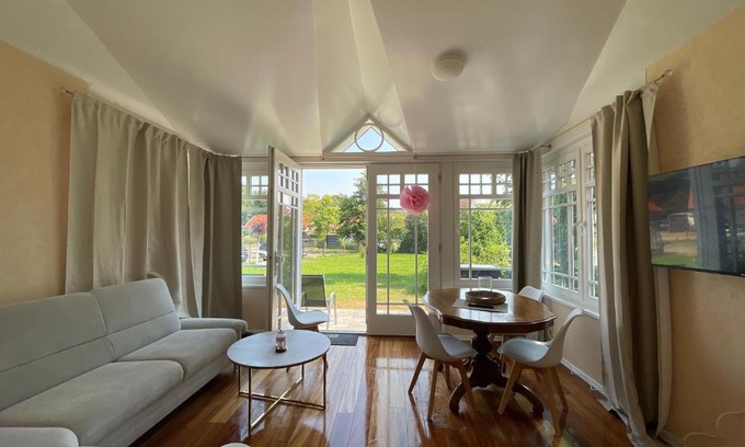 Food & DrinkTea/Coffee makerBathroomHairdryer, Toilet, Towels, Toilet paper, Shower, Bathtub or shower, Private bathroomMedia & TechnologyTV, Flat-screen TV, Streaming service (like Netflix)KitchenRefrigerator, Wine glasses, Dining table, Coffee machine, Electric kettle, Microwave, Kitchenware, KitchenetteGeneralPrivate entrance, Key access, Hardwood or parquet floors, Fire extinguisher, Trash cans, Heating, Hypoallergenic, Ironing facilitiesLiving AreaSitting area, Dining area, SofaViewViewBedroomLinens, Wardrobe or closetOutdoorsOutdoor furnitureAccessibilityEntire unit located on ground floorBuilding CharacteristicsPrivate apartment in buildingRoom AmenitiesSocket near the bed, Sofa bed |