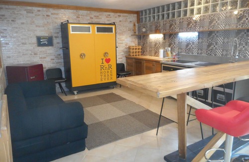 On the lower floor, a large loft (with access from both the veranda and the garden) offers 3 or 4 beds: a large double bed and a sofa bed that can be easily used as a second single bed or, when open, as a large double bed.