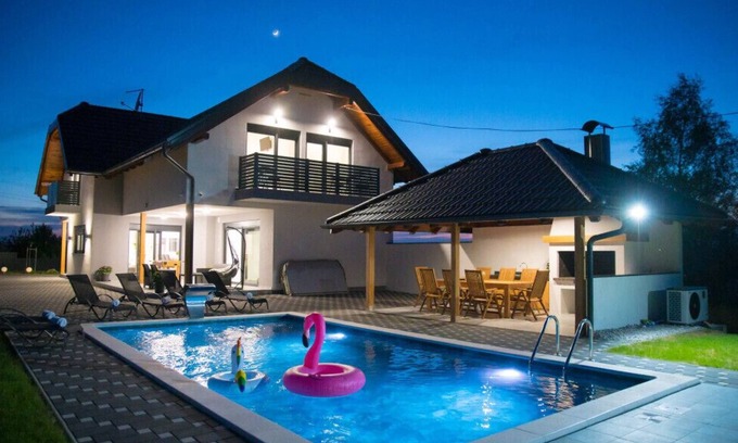 The villa in Ljubešcica has 4 bedrooms and has capacity for 10 people. The villa is nice, is spacious, and is 185 m². It has views of the garden and the swimming pool. The property is located 5 km from Novi Marof city, 5 km from Novi Marof supermarket, 64 km from Zagreb airport. The house is situated in a charming neighborhood in a residential complex.The accommodation is equipped with the following items: garden, garden furniture, fenced garden, terrace, washing machine, dryer, barbecue, fireplace, iron, internet (Wi-Fi), hair dryer, sauna, spa, central heating, air-conditioned, private heated swimming pool, open-air parking the same building, TV, satellite tv.In the induction open plan kitchen, refrigerator, microwave, oven, freezer, dishwasher, dishes/cutlery, kitchen utensils, coffee machine and toaster are provided.