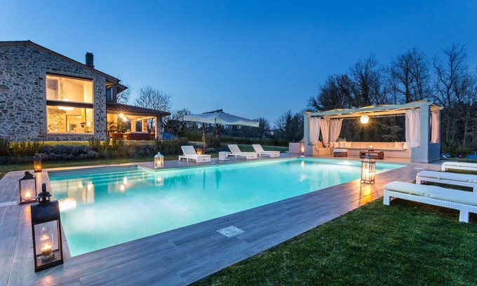 The gardens and outdoors of this distinctive Italian country house VILLA OTTO are simply magnificent. An ideal base for touring the beauty of Tuscany, the farmhouse is situated in Orentano, a delightful village full of folks events, food festivals and bespoke restaurants. The highlight of this villa is the proximity to all Tuscan major sites and things to see such as Pisa, Lucca, Pistoia, Florence, San Gimignano, Volterra and Siena: the villa is strategically located halfway between all these towns. The beaches of Viareggio, Lido di Camaiore and Forte dei Marmi are just 40 mins drive away so it is close to Cinque Terre as well. With its spacious, comfortable interiors and gorgeous outside spaces, it makes a wonderful option both for groups and large families.The ground floor has a fully equipped country-style kitchen, as well as grand living room with TV and dining area, all of which open to a pleasant porch/veranda overlooking the garden and the pool which is fully furnished with sofas, armchairs and another dining table. On the ground floor there is also a Master bedroom with its own luxury bathroom and a laundry room.Upstairs there are three bedrooms, bathed in natural light with 2 luxury bathrooms and a drawing room. The house is fully air conditioned and has a very reliable wifi connection provided by the national phone company.The private swimming pool is found next to the house, with a cosy gazebo to shade in and eight sun loungers.The beguiling grounds and interiors were designed by a renowned architect.Included in the rental price:Final CleaningTowels and linensElectricityGasWaterInternet WifiHigh chair (upon request at booking)Babycot (upon request at booking)Not included in the rental price:Tourist tax: mandatory and required by the local municipality, where applicable.Midstay and/or weekly cleaning and change of towels and linensBaby cot's linens