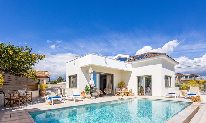 The villa is located just 100 metres away from a beautiful sandy beach (Mair beach). Another nearby organised beach is Alaminos beach (2km).