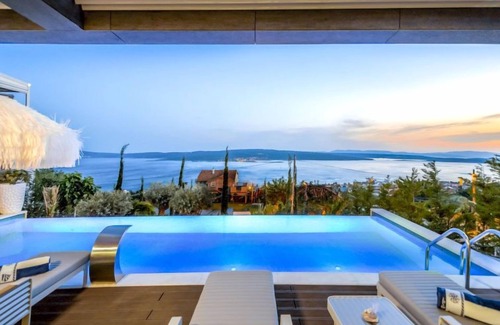Modern single-family house "Villa Panorama", 3 storeys. 2 km from the centre of Crikvenica, in a sunny, elevated position, 2 km from the sea, 2 km from the beach. Private: property 650 m2 (fenced) with wildlife garden, swimming pool angular, heated (11 x 4 m, depth 150 cm, seasonal availability: 01.Apr. - 30.Oct.). Shower/WC in the pool area, terrace (60 m2), garden furniture. In the house: internet access, sauna, hot tub, billiard table, air conditioning, washing machine, tumble dryer. Available: bicycles. Parking at the house on the premises. Shop 500 m, supermarket 1 km, restaurant 500 m, bus stop 2.9 km, pebble beach 2 km, public bathing area 3 km, concrete beach 2 km. Available: treadmill, orbitrek. Organizing a party is not allowed.