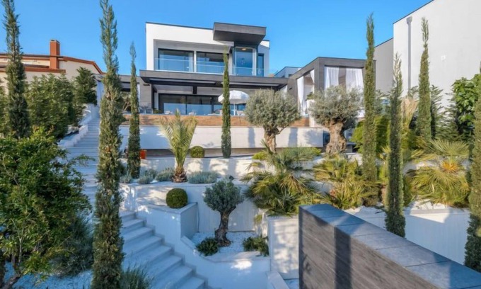 5-room house 270 m2 on 3 levels. Modern and luxurious furnishings: living/dining room 65 m2 with satellite TV (flat screen). Exit to the terrace. Open kitchen (oven, dishwasher, 4 ceramic glass hob hotplates, microwave, freezer, electric coffee machine). Upper floor: 1 room with 1 french bed (180 cm, length 200 cm), bathroom and hand-basin. Exit to the terrace. Sep. WC. 2nd upper floor: 3 rooms, each room with 1 french bed (180 cm, length 200 cm), shower/WC and TV (flat screen). Exit to the balcony. Floor heating. Balcony 15 m2, terrace 70 m2, terrace 15 m2. Terrace furniture, barbecue (portable), deck chairs. Beautiful view of the sea and the swimming pool. Facilities: safe, children's high chair, baby cot, hair dryer. Internet (WiFi, free). Parking (roofed, 1 car). Available: wine-cooler.