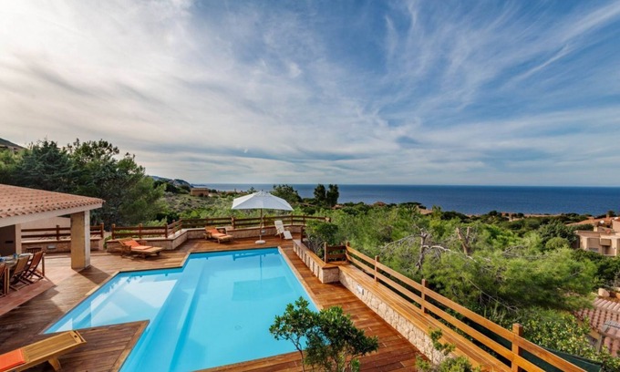 The villa is located in a very picturesque setting surrounded by greenery with a magnificent view of the sea in the front and on the rocks in the back. The outdoor area has been designed to offer guests a high standard of comfort and relaxation throughout the day. At the entrance a stone staircase leads to the belvedere, a large raised area with a magnificent view. In this area there is a small sitting area covered by a wooden pergola with a comfortable maxi relaxation sofa made with nautical cushions. From here you can fully enjoy the spectacle of the sunset while sipping a glass of wine. Next we come to the large solarium in fine wood and stone that surrounds the private pool. On the right the spa area, a cascade of water flows along a stone wall overlooking the sea where you can relax massaged by the water during the hottest hours. On the left a stone sofa with nautical cushions perfect for a cocktail in the evening by the pool. A large solarium area with sea view is equipped with sunbeds and parasol. The pool has been designed also for children with a large area of shallow water in which children can play in the presence of their parents and the older ones can relax lying down in a cool place.