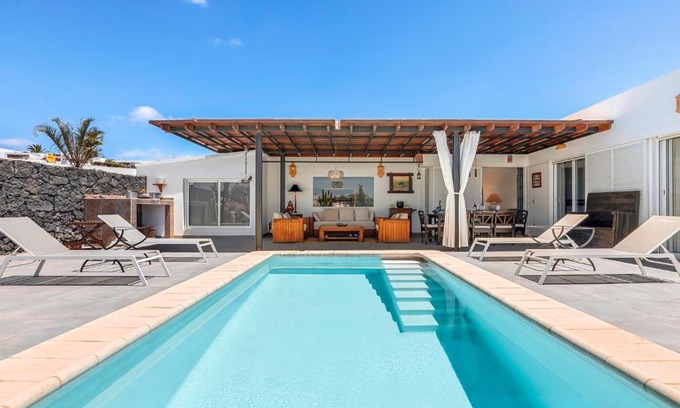 A 10-minute walk from Playa de las Coloradas in Playa Blanca, Villa Patos features accommodations with access to a solarium and open-air bath. This property offers a private pool, free Wifi, and free private parking. Outdoor seating is also available at the villa. Featuring a terrace with mountain views, this villa also includes a cable flat-screen TV, a well-equipped kitchen with a dishwasher, an oven, and a microwave, as well as 3 bathrooms with a shower and a hair dryer. The villa offers bed linen, towels, and laundry service. For those times when you'd rather not eat out, you can cook on the barbecue. Guests at Villa Patos will be able to enjoy activities in and around Playa Blanca, like walking tours and pub crawls. Both a bicycle rental service and a car rental service are available at the accommodation, while cycling and hiking can be enjoyed nearby. Parque Nacional de Timanfaya is 14 miles from Villa Patos, while Montañas de Fuego Mountains is 15 miles from the property. Lanzarote Airport is 19 miles away.