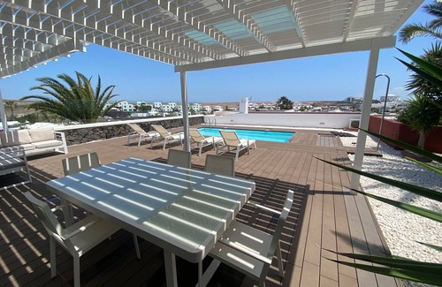 Villalia Patricia is fully equipped with a private heated swimming pool with views of the sea, Fuerteventura and the island of Lobos.Enjoy the sun in the wonderful outdoor area, a refreshing swim in the pool, a good book or an outdoor barbecue. The modern and comfortable interior invites you to relax.The villa consists of 3 comfortable bedrooms. One double bedroom with 1.50m x 1.90m bed and bathroom en suite, and two bedrooms with 2 single beds each. There is a shower room.The fully equipped kitchen with complete kitchenware offers everything necessary for food lovers, the house has all the usual appliances so that you do not miss anything. From the kitchen there is direct access to the terrace, so preparing a picnic while your family enjoys a swim is very easy and comfortable.The living room and dining room are also very modern and tastefully decorated.Villalia Patricia offers a wide variety of services for your comfort such as wifi service, Smart TV, 49 inch HD with the possibility of Netflix, Amazon Prime Video, Apple TV, HBO (you need to be a user to access the applications), air conditioning, comfortable outdoor furniture (hammocks, table, chairs, pergola and barbecue). This accommodation is equipped with private parking space and private and independent entrance.Located in Playa Blanca, just 5 minutes walk from the beach of Las Coloradas and very close to important places to visit such as Playas Papagayo, Los Hervideros and Timanfaya National Park.Ideal for a holiday with your family, couple or friends. Book now and enjoy your experience!