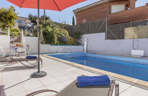 Els Boscos 7 km from Tarragona: Large single-family house "Villa Pedro", 2 storeys, built in 1980. On the outskirts, 900 m from the centre of Els Boscos de Tarragona, in a quiet, sunny position on top of a hill, 2.5 km from the sea, 2.5 km from the beach. Private: property (fenced), terraced garden, swimming pool angular (7 x 4 m, depth 120 - 200 cm, seasonal availability: 15.Jun. - 15.Sep.). Outdoor shower. Stepped path (15 steps) to the house. Public parking on the road. Shop 1 km, supermarket 500 m, restaurant 1 km, bar 500 m, bus stop "La Placa - Boscos" 600 m, railway station "Tarragona" 9 km, sandy beach "Cala Romana" 2.5 km. Golf course (18 hole) 6.5 km. Nearby attractions: Port Aventura-Ferrari Land, Jungle Trek, Tarragona. Hiking paths: La Mussara. Please note: not suitable for small children. Object suitable for 4 adults + 4 children. The owner does not accept any youth groups. Neighbourhood highly sensitive to noise. Quietness and good behaviour expected.