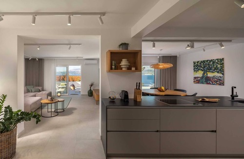 Outside, relax by the heated pool or in the integrated jacuzzi, with plenty of beach chairs and seating surrounded by olive trees. The terrace has a dining table and a wood-fired grill for enjoying outdoor meals. Villa Petra Stella is pet-friendly upon request (charges may apply) and has many children-friendly amenities such as a baby cot and chair.