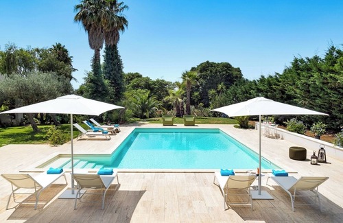 Outside, the villa offers beautiful, large and covered terraces, perfect for al-fresco dining and a patio with pergola. The beautiful garden filled with Mediterranean plants and flowers has a private swimming pool (6x12m; 1.2 – 2.5m deep) which can be heated on request (Open from 01/04 to 10/11; heated up to 25°C) with external shower, sun lounges and umbrellas.