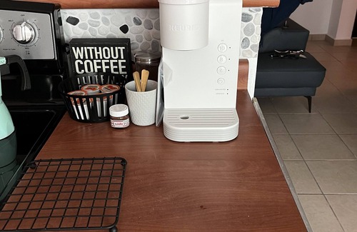 You’ll love the fully equipped kitchen , living room, and the large terrace. It has a fridge with a freezer, microwave oven, oven, toaster, Keurig coffee maker. The kitchen is fully supplied with all the dinnerware and cooking ware needed for an extended stay.