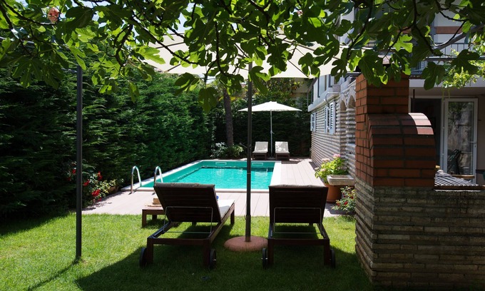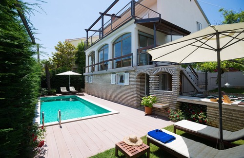 Villa holiday house for 8 persons 280 m2 on two floors plus ground floor with 400 m2 garden and swimming pool 30m2 mosaic in emerald green. the pool decking beaches in tobacco color. Two bedrooms with double beds are on the second floor exposed to the south with big terrace of 30m2 overlooking the sea. On the same floor there are one bedroom with two single bed and two bathrooms with shower . Second floor and connected to the first floor the staircase in oak and also with the outside staircase. On the first floor there is the main entrance, room with two single beds, another bathroom with shower, laundry, large living room with kitchen, glazed porch with trim room. Veranda is connected with the garden by the scale. On the ground floor there is the entertaiment room with consol of play station, movies in the context there another summer kitchen with all necessary . Garden with big table for 12 people and a grill to enjoy wonderful evenings, Deck chair for soaking up the warm sun of Premantura.
