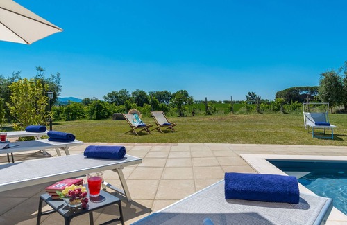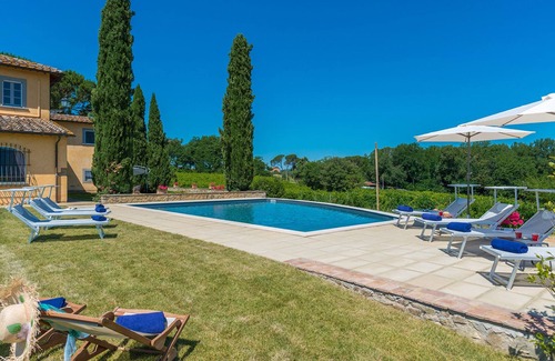 Villa Pucci is surrounded by a well cared-for park immersed in the tranquility of the countryside, with a large lawn that extends along a flat and completely fenced-in area, bordered along the whole perimeter by the vines of the property. Just past the entrance gate is the parking area conveniently close to the main entrance. Here we find the outdoor dining area covered by a large umbrella and equipped with a gas-powered barbecue, a seating area with sofas, a play area protected by the shade of the pine grove and the panoramic pool area, all in the immediate vicinity of the house entrances.Please notice that photos are taken in spring, therefore flower blossoming, and the colours of the gardens' grass could be different at the moment of your arrival at the villa.