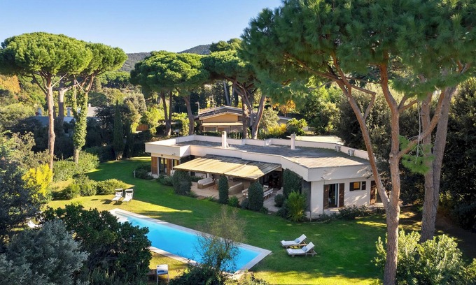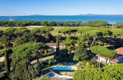 Villa Puntala is a single-storey elengant villa set in a pine forest just 700 m from the beach in the Maremma region of southern Tuscany. Designed for comfort and relaxation, it offers spacious living areas with travertine marble floors, large windows and five bedrooms with en-suite bathrooms and direct access to the garden. The shaded terrace and pergola are well furnished for dining and outdoor living, and the 16-metre saltwater pool is surrounded by verdant lawns and lush vegetation. The villa is within easy reach of Cala Violina, Castiglione della Pescaia and other coastal spots, with riding stables and a golf club just a short drive away.