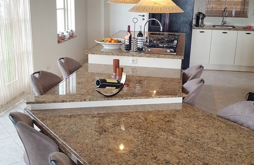 entrance with toilet, wardrobe, large open kitchen with cooking island, living room with large natural stone table (10 pers), large sitting area with 3 sofas, lounge chair, tree trunk table, fireplace (gas), flat screen TV 55 inch (digital, international channels + Netflix) , open staircase, patio doors to garden and veranda, 1 x double bedroom with a double bed. Also a space + bay window adjacent to the living room of approx. 16m² (former office) which is now furnished as a "game room" with all kinds of board games ranging from cards to yatzee, scrabble, casino game, stratego, etc. for all ages. In addition, an Xbox and a Wii including a number of games and a TV for gaming.