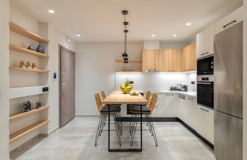 The main entrance opens up to an open plan area featuring the living room with corner sofa, 50 HDTV and fully equipped kitchen with built-in branded appliances and indoor dining area. Two bedrooms with a king size bed (1,60 X 2,00), 43 HDTV and en-suite bathroom with double sinks and shower cabin with hydromassage column are also available. The living room and both bedrooms provide direct access to the pool terrace, thanks to their floor-to-ceiling glass doors and enjoy beautiful sea views.