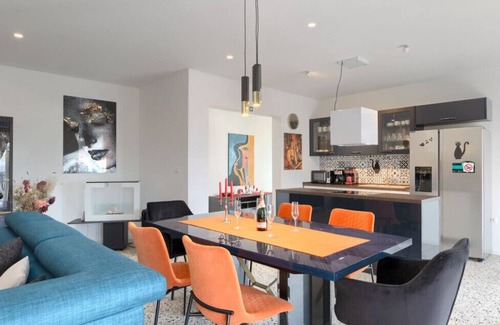 The kitchen, dining room and living room are located in a large open space with modern furnishings and access to the terrace with swimming pool. The kitchen is fully equipped with everything you need to prepare a meal, including appliances such as a filter coffee maker, espresso machine and ice maker. The living room has a comfortable sofa, smart TV with streaming services, a fireplace and a piano for a special atmosphere.