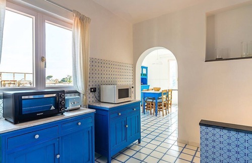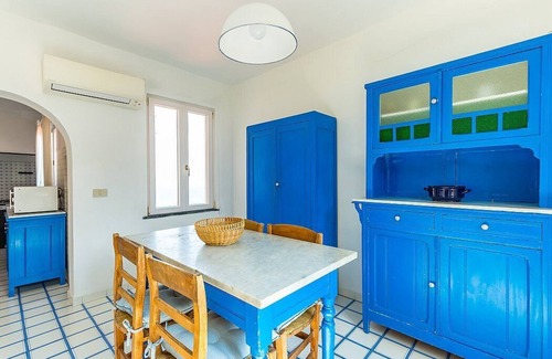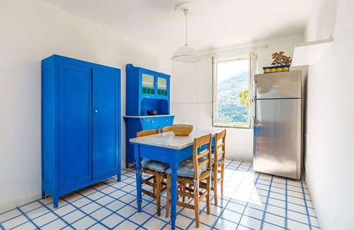 You will be able to enter the kitchen from the entrance hall climbing five steps. It is equipped with a four-burner gas cooker, an electric oven, a refrigerator with freezer, a dishwasher, a microwave oven, an Italian-style coffee-maker, an American-style coffee-maker and other small appliances. Here you will also find a washing machine (hidden in a cabinet), an iron and an ironing board. The dining table can accommodate four guests. The kitchen has two windows with a view of the sea, and is equipped with an air conditioning/heating unit.