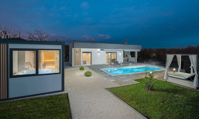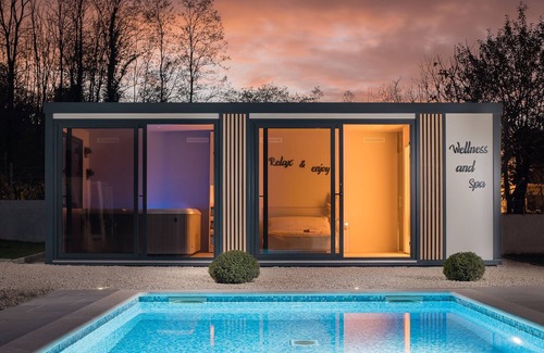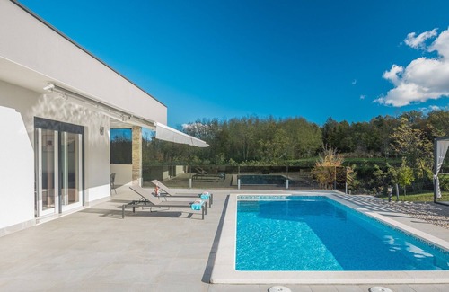 Surrounded by vineyards, Villa Romansa is a modern villa with a heated outdoor pool and a wellness area complete with a Finnish sauna and Jacuzzi. Located on a private property in a small, peaceful Istrian village, this love oasis has everything you need for the perfect romantic escape. Villa Romansa is just an hour's drive from Rijeka, 7km from the center of Labin, and 15 km from the nearest beach in Rabac.