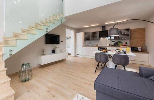 Villa Rotonda consists of three separate units, every one of them with a separate entrance: two apartments and a bedroom, the house is rented out as a unit. One apartment, with entrance from the swimming pool area, has on the ground floor a living room with sleeping couch for two kids, fully equipped kitchen, dining room and bathroom, one bedroom is upstairs. The entrance for the separate bedroom with en suite bathroom is also from the swimming pool area. The other apartment with entrance on the upper floor consists of a living room, fully equipped kitchen with dining room, bathroom and two bedrooms, one of them with a private bathroom.