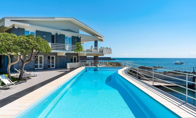 Villa Sabe is a luxurious seafront villa with a private pool located on the edge of the characteristic seaside village of Stazzo (near Acireale), between Catania and Taormina. The property, surrounded by large terraces and a well-kept garden with an exclusive swimming pool (6 x 20 m), overlooks the lava rock cliff and the sea, to which it has direct access.