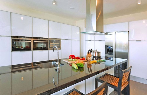 The ground floor has an additional bedroom with private shower room, which is suitable for wheelchair users, another bathroom with shower and the large living room with dining area and open kitchen. The well-equipped kitchen has in addition to the usual household appliances and a vinotheque. The villa is also equipped with air conditioning and safe. Other amenities include Wi-Fi, satellite TV, DVD players, music systems and iPod docking stations.