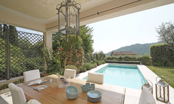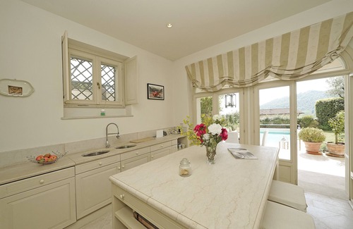 Villa on three levels: entrance level with atrium and French windows with balcony overlooking the pool and lake view; living room with 2 two-seater sofas; going up the stairs you will find: master bedroom with double bed, air conditioning, walk-in wardrobe and private bathroom with double sink, toilet, bidet and Jacuzzi; 2nd bedroom with single bed and bathroom with toilet, bidet and shower all in one room; 3rd bedroom with double sofa bed. Going down the stairs you reach the real ground floor with: large separate fully equipped kitchen with peninsula: dishwasher, oven, coffee maker, toaster, crockery; from the kitchen there is direct access to the porch equipped with dining table and chairs and the private swimming pool. To the side is a small outdoor kitchen. On the same floor is the third separate bathroom with double washbasin, shower, toilet and bidet with French window overlooking the garden. Continuing on, there is access to a laundry area with washing machine. The villa then continues with an air-conditioned annexe, united but separate in space: it consists of a double bedroom, a private bathroom with toilet, bidet and double shower and a second fully equipped kitchen with: oven, microwave, toaster, blender and professional bar coffee machine. Media: smart tv Wifi: included . 2 private outdoor parking spaces inside the property. EXTRA SERVICES: private chef on availability on advance reservation