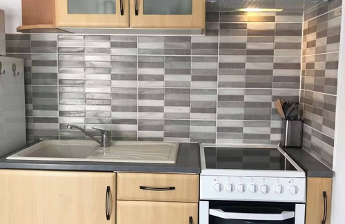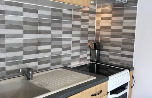 Fully equipped kitchen: electric stove, oven, fridge-freezer, microwave, coffee maker, toaster, and kettle.