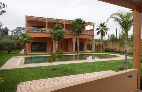 c'est un écrin de verdure avec une grande piscine dans la campagne à 30 minutes du centre de Marrakech, et 50 minutes des cascades de Ourika. ( pour manger les tagines et boire du thé les pieds dans l'eau )