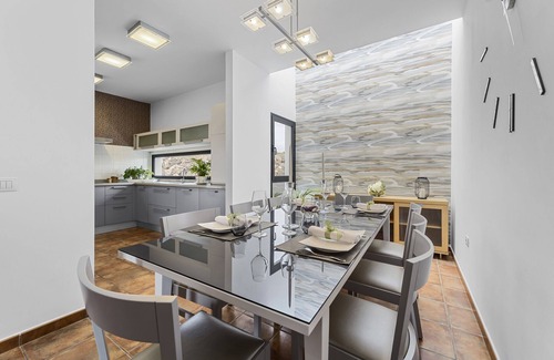 It has a heated pool at 27ºC, three large covered terraces and two living rooms with large windows that will allow you to enjoy wonderful views of the sea and the volcanoes. The home is fully equipped to make your stay a unique experience.
