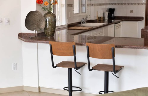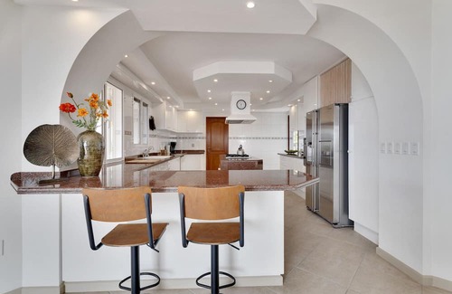 Kitchen: Our fully equipped kitchen is a chef's delight, complete with high-end appliances, ample counter space, and everything you need to whip up delicious meals. Dine al fresco on the terrace and savor panoramic views of the ocean and lush garden.