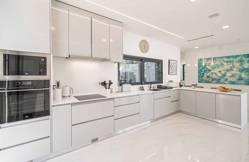 This meticulously appointed villa boasts a refined aesthetic, adorned with pristine white marble flooring, expansive floor-to-ceiling sliding glass doors, and a centralized control system for lights, blinds, and blackouts. The state-of-the-art kitchen and an indulgent leisure/games room contribute to an opulent atmosphere, making it an ideal choice for an idyllic holiday in Madeira.