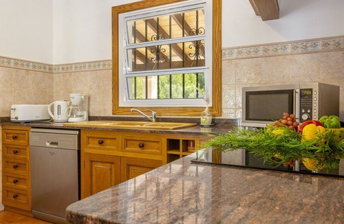 The villa has a spacious terrace with a cosy dining area, both indoors and outdoors. Here you can enjoy your meals with a wonderful view. The fully equipped kitchen has everything you need for a culinary experience - from an oven and fridge to coffee and tea making facilities.