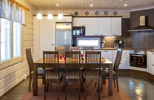 This separate luxury holiday villa was completed in 2011. Located in silent place in Vuokatti, near by the ski tracks and hiking routes. Villa Sofia is 2-storey villa, living area 140m². There is wide combined living room & kitchen, fire place, two bedrooms on 1st floor: both with beds for two. Utility room, sauna (electric heating), washroom/toilet and separate toilet. On 2nd floor there is a two bedrooms with beds for two. Shower and toilet alson on the 2nd floor. Terrace.