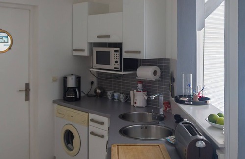 Fitted kitchen (approx 9 m2) and equipped including: sink 2 stainless steel round tanks, gas hob 4 burners, hood, electric oven and microwave, fridge-freezer, dishwasher, washing machine, coffee maker, grill bread ... open to the living room.