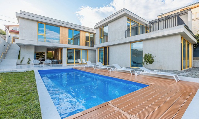 Our villa features a modern interior design with floor-to-ceiling windows and can accommodate up to 14 guests + 1 (folding bed on request), providing convenience and flexibility for families and group stays.