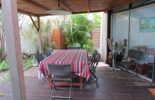 The villa 'TALITAKOUM is located 80 meters from the beach and lagoon of the Saltworks baths. Surrounded by a tropical garden, shaded, it is composed of 2 verandas, a living room with a bed doubles sleeping area separated by curtains, two bedrooms, one double and one with 2 single beds, a bathroom , an equipped kitchen LL LV. In the garden there is a Balinese bed, an outdoor shower and a canoe available. Car park. BBQ. TV and WiFi.