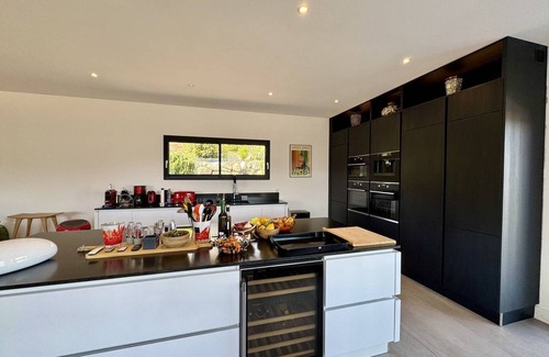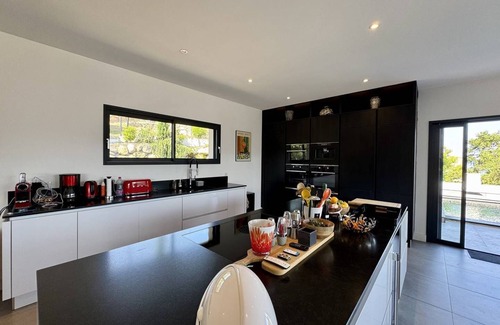 On the first floor, a large living room with bright living room, fully equipped open kitchen, dining area and living room giving access to the furnished terrace and swimming pool, ideal for convivial moments. A laundry room, two beautiful bedrooms each with queen size bed, shower room, WC and sea view.