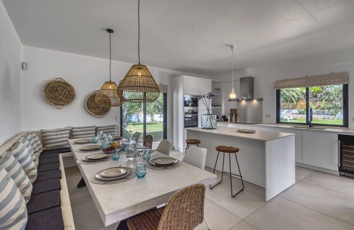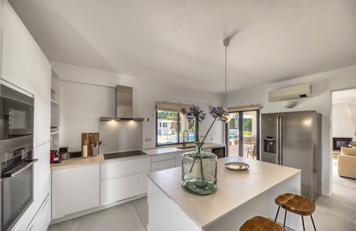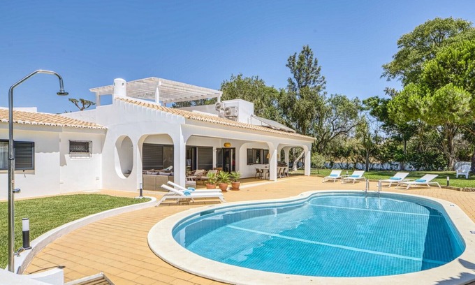 Villa Torrinha is a beautiful villa situated in a calm and quiet valley. With a magnificent view of the gorgeous Monchique mountains on one side and an extensive overview of the nearby town of Lagoa on the other side, villa Torrinha gives off a magical feeling where everyone can enjoy the peace and quiet that the Algarve has to offer.The villa offers one of the most luxurious experiences you can find. Equipped with a large and beautifully decorated garden, a private pool, and traditionally designed furniture, it's hard not to find a reason to fall in love with it. The sheer size and layout of the villa create an environment that allows all types of guests to enjoy their stay.The clean and unique architecture combined with the comfortable and stylish furniture creates a welcoming feel; this combination complements its surroundings perfectly and makes for the ideal foundation from which you can start your unique Algarve experience.Guests can also enjoy an incredibly well-designed rooftop terrace, from which they have an amazing view of the nearby citrus and strawberry farms that surround the villa. Keep an eye out for beautiful birds that like to cool off in the shade on the branches of the fruit trees and skittish salamanders that enjoy sunbathing on the picturesque stone walls.Accommodation: 8 to 10 guests, 4 bedrooms (double beds, with 2 rooms having sofa bed solutions to fit another guest), 4 bathroomsInterior:Reception hall with guest bathroomLiving room with flatscreen TV, Sonos-sound system, fireplace and lounging sofaState-of-the-art kitchen with American fridge/freezer combo, 2 ovens, wine cooler, induction cooker and dishwashing machineDining room that seats 12 guests with a couch/chair comboBedrooms with en-suite bathrooms equipped with showers, sinks and toiletsStudy room with desk, fiber internet and separating door.Exterior:Roofed terrace with an outside dining area (12 guests), barbecue and comfortable lounging setLarge parking space that can comfortably house multiple vehiclesPool area with comfortable lounging chairs, a bar and storage shedWraparound garden decorated with traditional-style stone walls and beautiful metal doors and windowsSide entrance/sitting area with multiple chairs, ping pong table and access to the roof terrace.Additional facilities:Air conditioning in the bedrooms, living and kitchen areasUnderfloor heating in the living room, kitchen and bathroomsFiber internetWashing machine10-minute drive to Carvoeiro and Ferragudo beaches and a 60-minute drive to the airportLess than a 5-minute drive from the nearest golf courses. (Vale da Pinta and Gramacho).