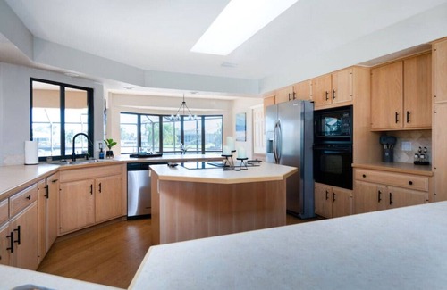 Unwind by the newly renovated heated salt-water pool and spa, then enjoy al fresco dining with an outdoor dining table and grill, all within the lanai. Gather around the propane coffee table firepit in comfortable outdoor seating and take in the panoramic view of the canal and dock, while watching for manatees and dolphins. For those seeking adventure, we provide 2 kayaks, 4 bicycles, fishing rods, and a private dock. Please be mindful that due to wildlife considerations, swimming in the canal is not recommended. All amenities are provided free of charge.