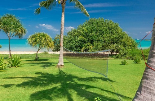 Take a stroll in the soft sands of this beachfront property, swim in the warm waters of the bay or float in the infinity-edge swimming pool