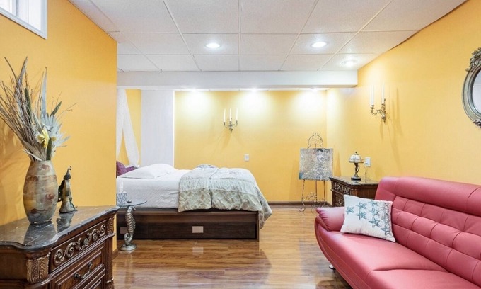 This is a spacious bedroom with a private bathroom and living room in the newly remodeled basement.