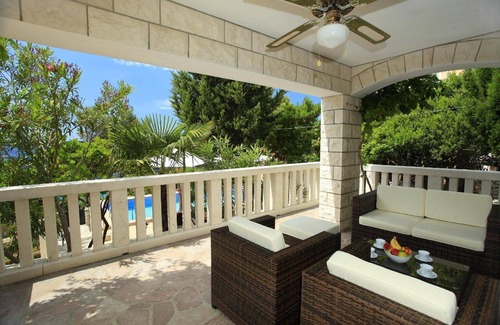 This house is a stone villa, built in the Dalmatian style, surrounded by a park with typical Mediterranean plants, through which a private path leads to the beach. The villa consists of ground floor and first floor. On the ground floor there is a kitchen, dining room with fireplace, two bedrooms and a bathroom. On the first floor there is an aperitif bar with a pool table, two bedrooms with wooden floors, a bathroom and a balcony. The floor is reached via an external staircase. All rooms have air conditioning. Two of the four rooms are furnished with a French bed (150 x 195 cm) and the other two rooms each have two single beds (90 x 195 cm). From the house you can access the large, partially covered terrace with its cosy lounge furniture. Relax by the pool and use the outdoor barbecue to prepare meals. There are plenty of sun loungers available. There is also a small arbour that provides protection from the sun.