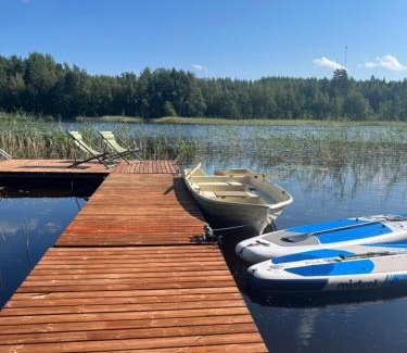 Featuring a garden, Villa Wanda features accommodations in Savonlinna. This beachfront property offers access to a terrace and free private parking. Outdoor seating is also available at the villa. This villa includes 4 bedrooms, a living room and a flat-screen TV, an equipped kitchen with a dining area, and 2 bathrooms with a shower and a washing machine. Towels and bed linen are available in the villa. There's also a seating area and a fireplace. Fitness classes are available at the property. Fishing and canoeing are possible within the area, and Villa Wanda offers a private beach area. Savonlinna Airport is 46 miles from the property.