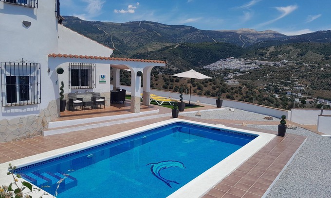 Casa Jazz is set above the village of Archez with fantastic views to the villages of Competa and Canillas de Albaida. The private pool and outside areas are the perfect place to spend a relaxing day away from it all with an outside shower to cool off. There are facilities for outside dining and a separate seating area. The villa is equipped with six sunbeds complete with mattresses for your comfort. There is a large lounge, dining room and well equipped kitchen in addition to the three bedrooms and two bathrooms. The views from the terrace of the mountains and villages are well worth the climb up the access road. The road to the property is mainly concrete with only the last 100 metres being dirt track, but it is steep and bendy. This property is not for the nervous driver. A new artificial grass area has recently been added.