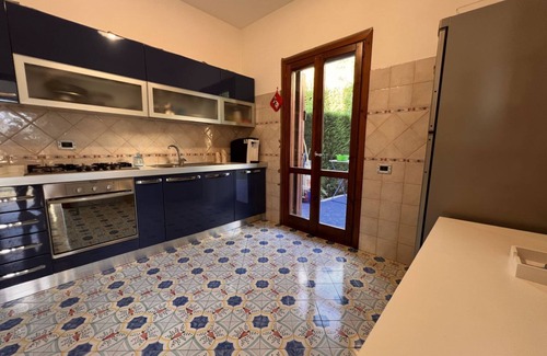 The living area features a spacious and bright living room, flanked by a modern kitchen that opens onto the outside. A shaded veranda invites you to enjoy pleasant moments al fresco, from relaxing breakfasts to sunset dinners, while the outdoor space, surrounded by greenery, offers an atmosphere of peace and privacy. The property also features private parking and a barbecue area, designed for relaxing conviviality. Guests also have access to the residence's shared swimming pool, the perfect place to cool off on summer days. Its privileged location allows you to reach nearby beaches in just minutes and admire spectacular sunsets, making this villa an ideal choice for families seeking a holiday characterized by elegance and the beauty of the sea.