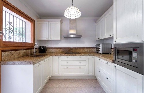 Mediterranean style villa surrounded by old pine trees. Located in a private urbanization within walking distance to the beach, private pool, sea views, large terrace. In urbanization there are security, supermarket, tennis courts, a beach cafe and a restaurant directly on the beach with live music (beach-club). Urbanization refers to a conservation area due to the rare species of pine trees and plants. On a private sandy beach 500 meters long can be accessed only by residents of urbanization. Villa located in the central part of a huge gorge, it has a classic V-shaped sea, surrounded on three sides by the road, which gives the villa a good privacy. Located on a street with very minimal movement. Constant breeze from the sea makes it possible not to use air conditioning even in August. Virtually none of them and did not use due to the unique climate conditions. Summer temperatures below 5-7 degrees than 10 km from the sea, and vice versa in the winter warmer by 4-6 degrees.