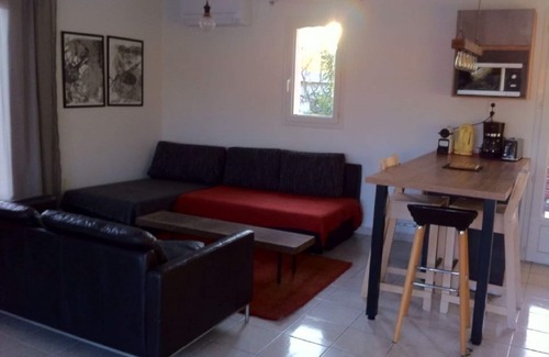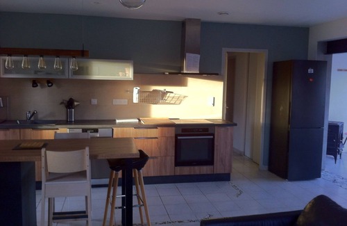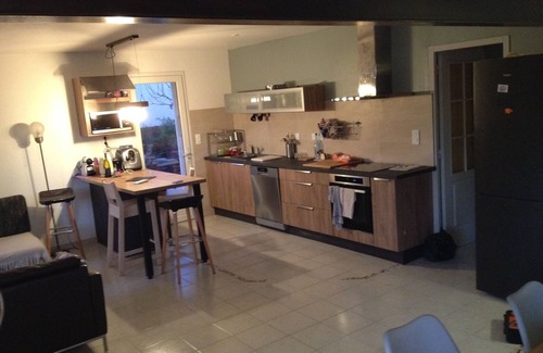 Living room / kitchen: large convertible sofa, TV, fitted kitchen: INDUCTION, oven, fridge / freezer, microwave, toaster, kettle, coffee maker and Nespresso.
